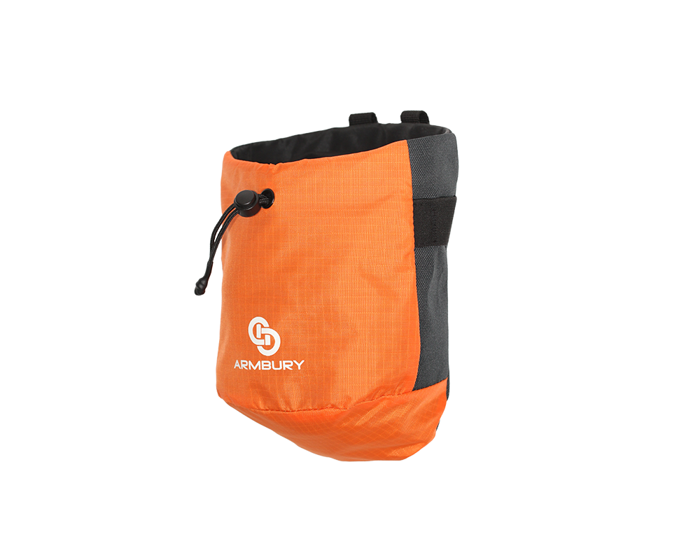 Classic round chalk bag made of durable fabric and fleece lining inside. Equipped with brush holder and waist belt.