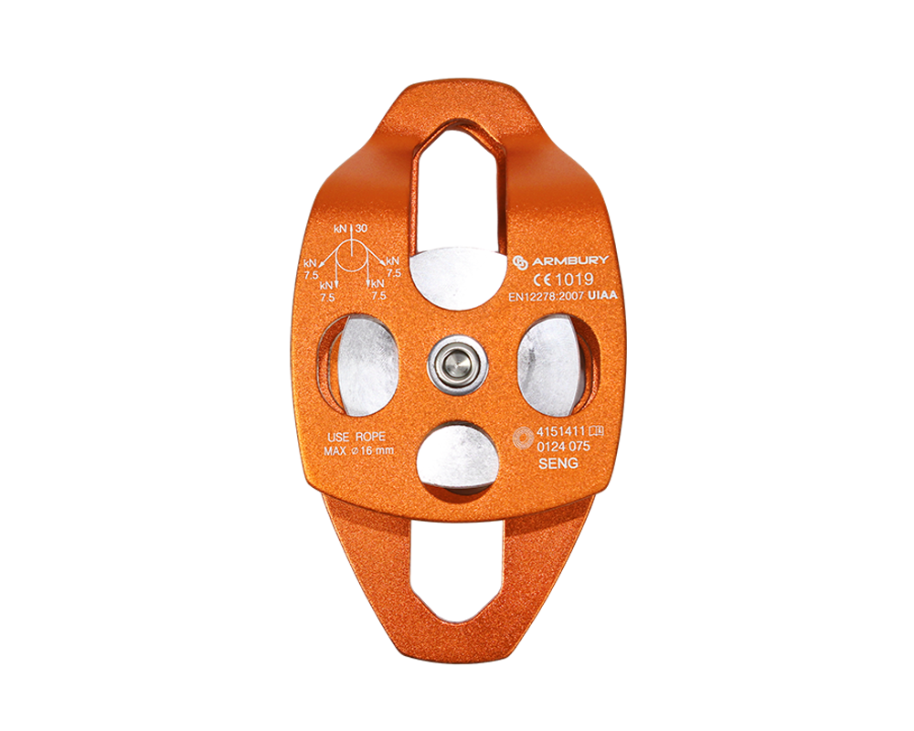 Light alloy single pulley with mobile plates and brass bearings for multiple use.
