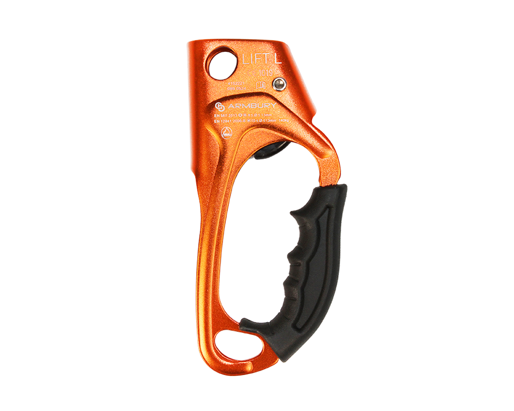 Light alloy hand ascender with ergonomic rubber grip for rope ascent. The stainless steel cam insures a high resistance to wear and tear. Eyelet at top for clipping a carabiner. Very simple and quick manipulation. Available in models for left hand and right hand. Ideal for climbing, rescue and rope access.