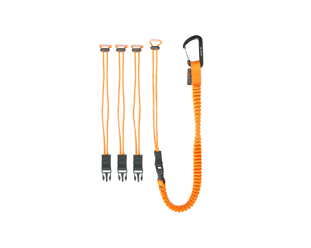 The bungee sling attached to harness prevents equipment damage, worker injury, and even